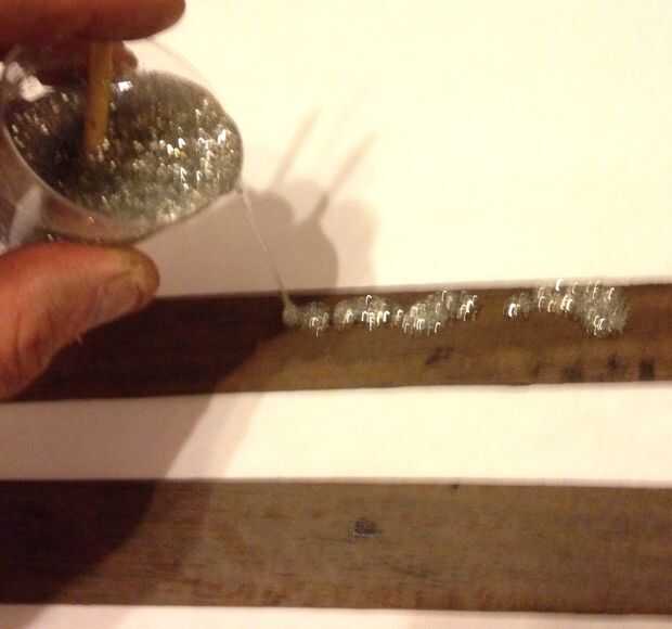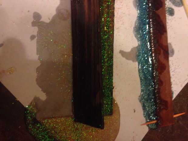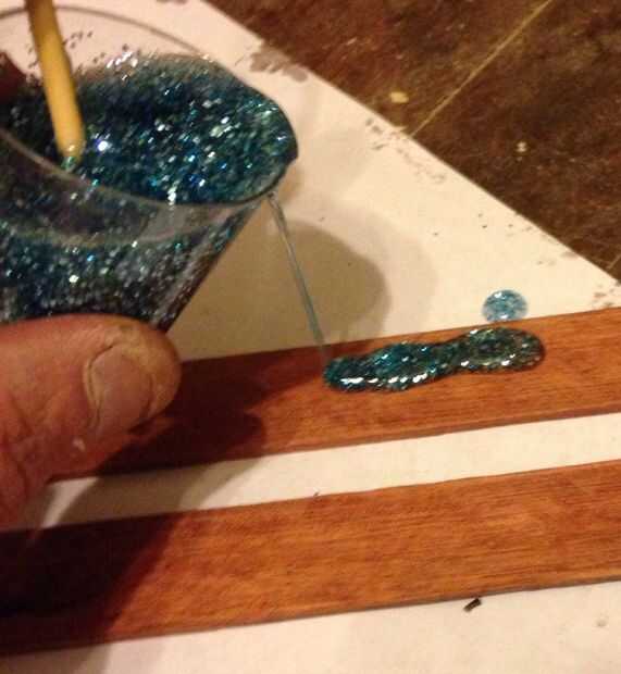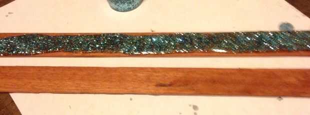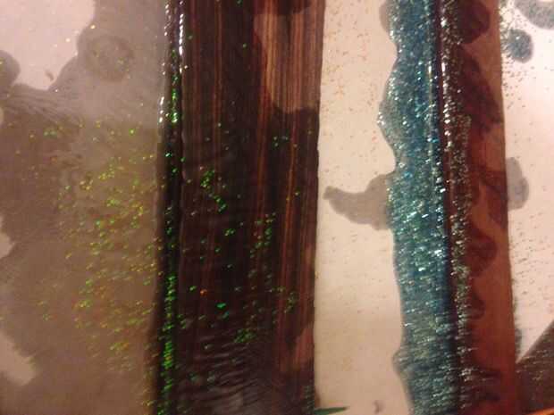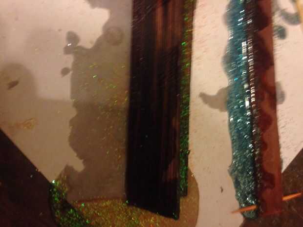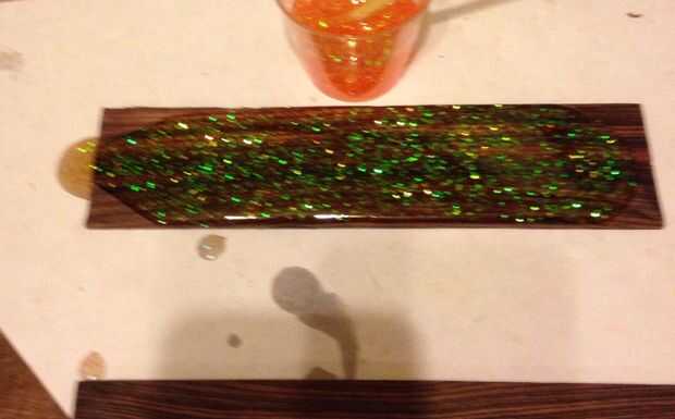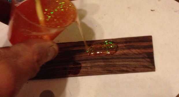 La tira de madera de lay en señalado una superficie plana y vierte resina, extensión si es necesario, cubriendo la superficie. Dejar reposar un par de minutos un poco curar y mantener la forma. Poner juego tira madera encima y déjelo curar durante la noche.
