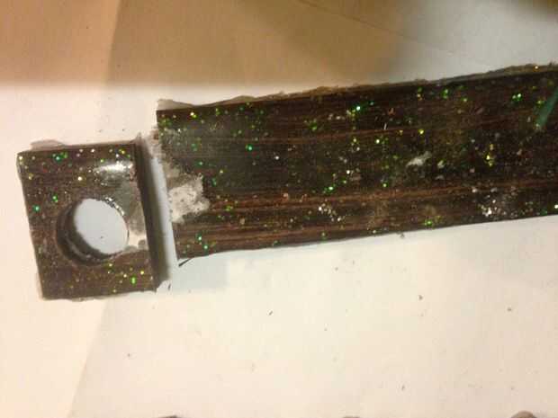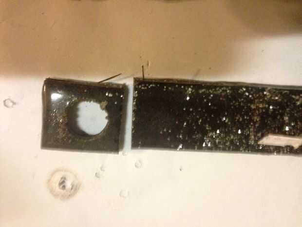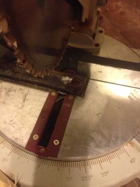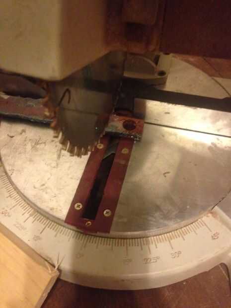 y luego utilizando una tabla de sierra o sierra para cortar ingletes, corte aproximadamente 1/4" al lado del agujero que se perforó.