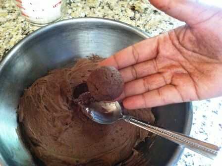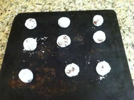 Rodar la bola en impalpable o azúcar en polvo para recubrir. (Me resulta más fácil poner el azúcar en polvo en una taza de medir y agitar la masa alrededor de la taza para cubrirlo.)