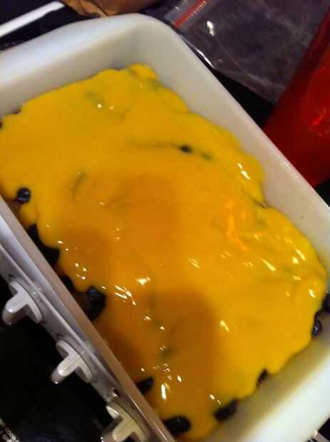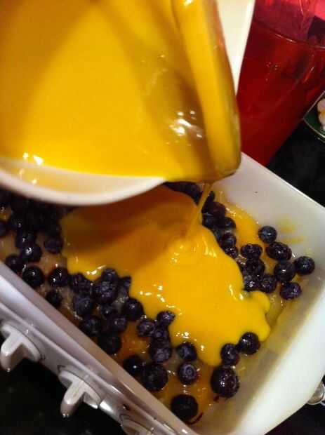 Vierta la mezcla de flan sobre la parte superior de las capas de frutas baya y tratar de repartir uniformemente por lo que va directamente a las esquinas.