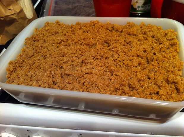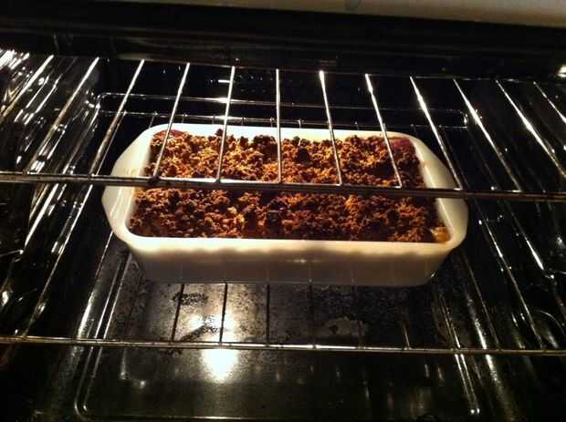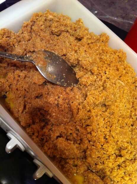 Luego se extendió la mezcla se desmoronan sobre la parte superior, otra vez se separa a los bordes del plato.