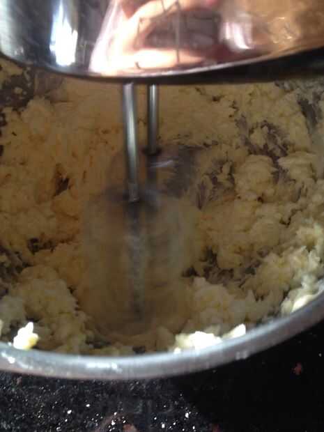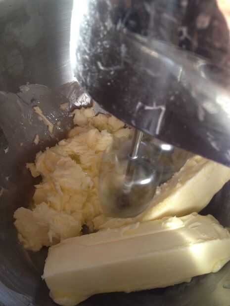 En un tazón grande batir la mantequilla hasta liso y cremoso. Añadir el azúcar y continuar batiendo hasta suave y esponjosa, unos dos minutos. Agregue los huevos y la vainilla y se combinan.