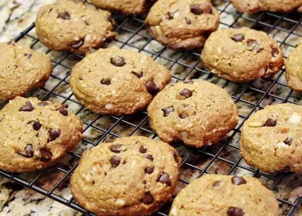 En su batidora con el accesorio de paleta a velocidad baja, mezcla la mantequilla derretida y el azúcar de coco. Añadir los huevos, la leche y la vainilla. Lentamente agregar el ingrediente seco mezcle en el tazón de la batidora... mezcla hasta combinar bien. Añadir trocitos de chocolate y nueces de macadamia en la posición de "Revolver" hasta que sólo se mezclan.