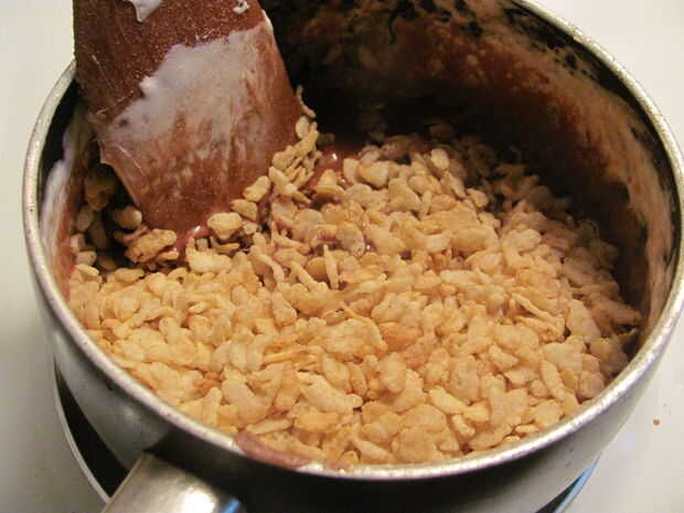 Nutella cuando es mezclado con marshmellows derretidos, luego agregar 2 tazas o más, dependiendo de qué tan grande quieres el lote de cereales Krispies de arroz libre de Gluten.