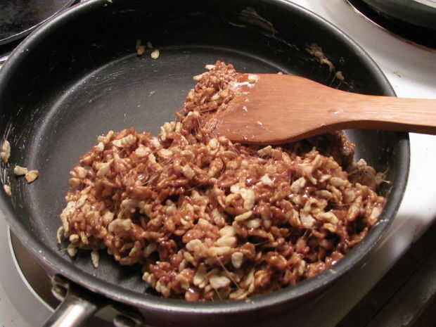 Una vez que se vierte el cereal, se mezclan los marshmellows/Nutella derretida y cereal Rice Krispies.