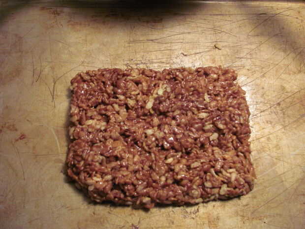 Después de completar el paso 7, luego coloque mezcla de cereal de arroz Krispies en una hoja de galleta. En cuanto se enfría forma en una plaza.