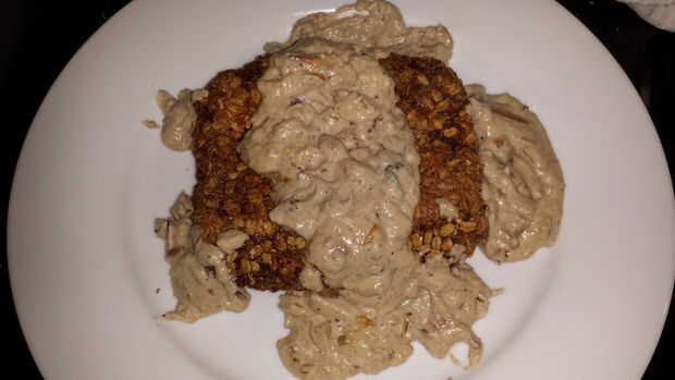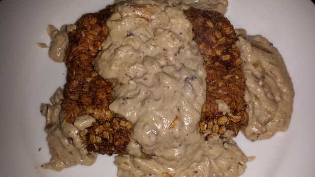 Gluten Free país frito salchichas con salsa seta Chanterelle