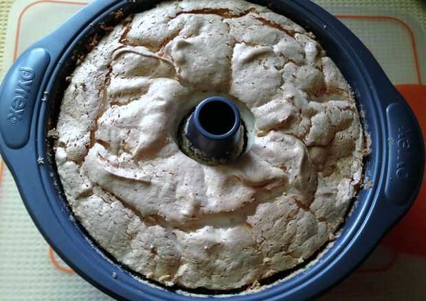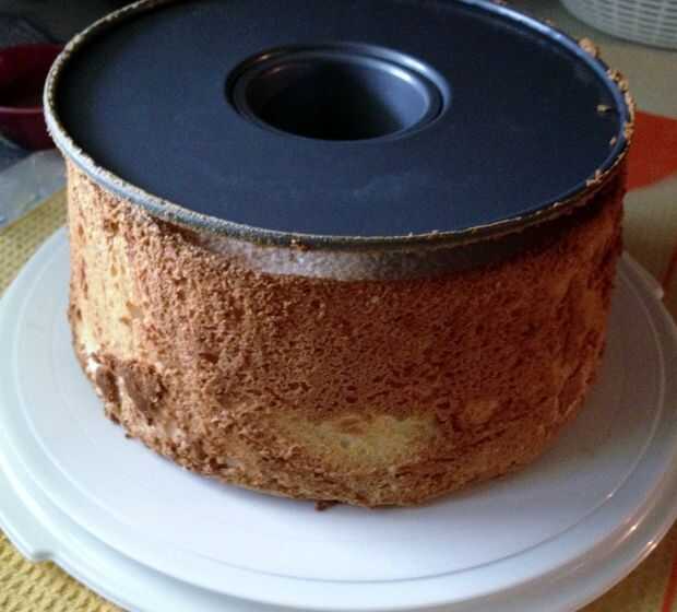 Sacar el pastel del horno e invertir la cubeta sobre el cuello de una botella resistente al calor o embudo, suspender el pastel boca abajo como se establece y se enfríe, aproximadamente 2 horas.