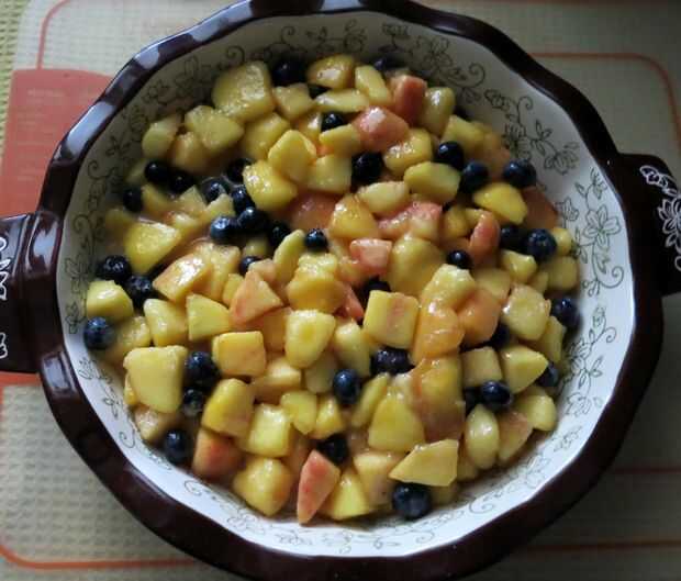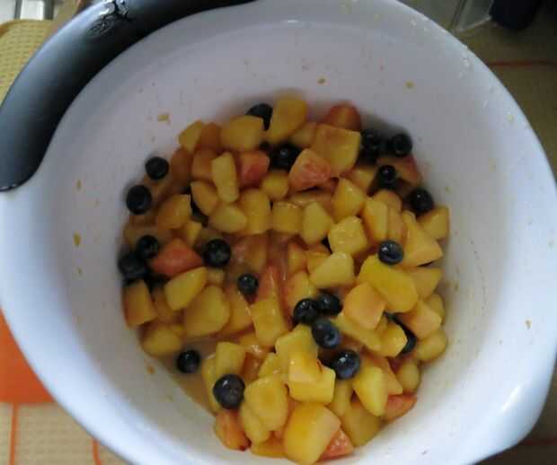 Melocotones a través de colador interior tazón de fuente de drenaje, reservar el jugo de durazno. Volver drenado duraznos al recipiente original y mezcle con jugo de durazno 2 cucharadas reservadas, almidón de tapioca, canela, licor de Amaretto y arándanos. Transferencia a la tartera de 9 pulgadas de plato hondo o cuadrado de 8 pulgadas hornear y presione suavemente en una capa uniforme. (Si usted bebe el jugo de melocotón restantes no dicen alma.)