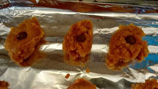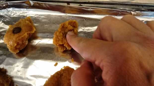 Poner una cucharadita redondeada de tu masa de galletas de mantequilla de maní en una bandeja para hornear galletas y presiona en una viruta del chocolate en cada uno. O cerdo salvaje y cubrir la galleta con chispas de chocolate. Nos gusta el embargo.