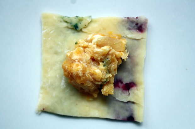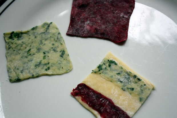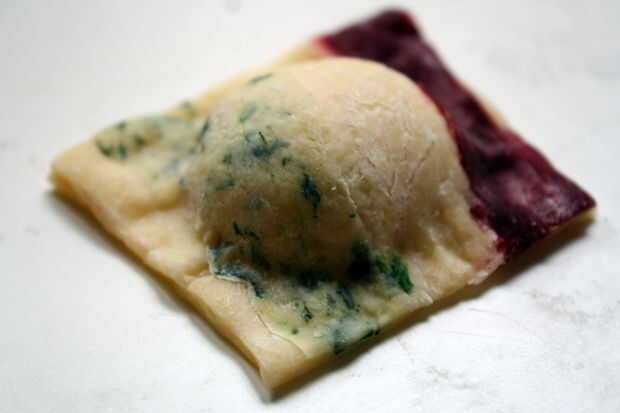 Añadir un pequeño asegurarla de relleno sobre un cuadrado de masa. Con el dedo, poner una pequeña cantidad de agua a lo largo de los bordes limpios de la pasta, para actuar como pegamento de la capa superior. Pone en su capa superior de pasta en la parte superior y presione firmemente para sellar. Tratar de empujar el aire fuera del centro de los raviolis para evitar que la pasta abre al hervir más adelante.