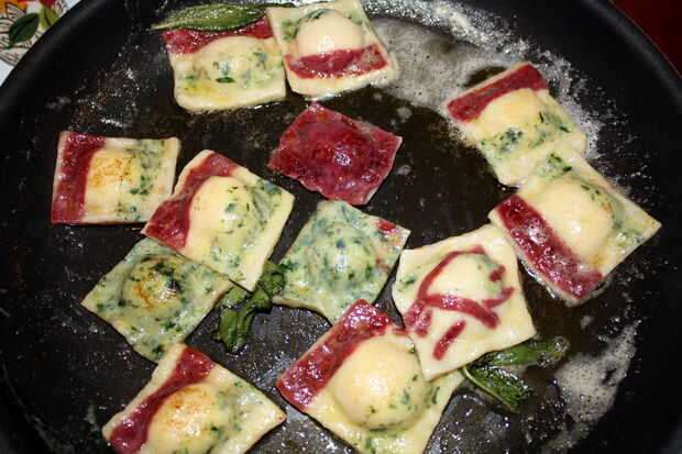 Cuando se acaban los raviolis hirviendo, drenar el agua y añadir los raviolis en la sartén con la mantequilla caliente. Dorarlas un poquito.