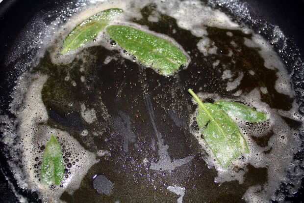 Mientras se cocinan los ravioles, derretir la mantequilla en una sartén y añadir que hojas de la salvia entera. Dejar la mantequilla y salvia cocinar juntos hasta que la mantequilla se Dora ligeramente. Sal y pimienta al gusto, o si aquí si desea, agregue jugo de limón.