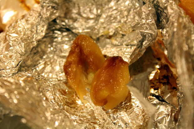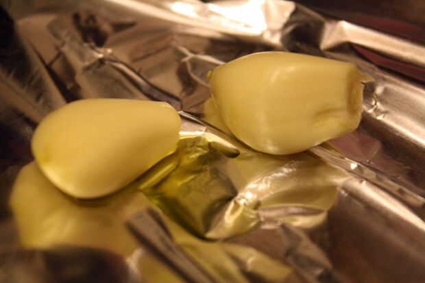 Poner dos dientes de ajo pelados en una hoja de papel de aluminio de 5 pulgadas de largo. Añadir aproximadamente un cuarto de cucharadita de aceite de oliva y extenderlo sobre el ajo. Envuelva el ajo firmemente en el papel. Agregar otra capa de papel de aluminio en la parte superior si quieres ser muy cuidadoso! Coloque la envuelto a ajo en una placa para horno forrada de papel de aluminio. Esperar hasta el siguiente paso a poner el ajo en el horno, que se realizará en el mismo tiempo que la calabaza.