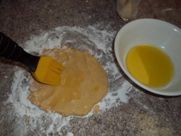 Con almidón de Tapioca y pizca de aproximadamente un sexto de la masa de polvo el contador y su perno de balanceo. Rodillo hacia fuera a cerca de 1/4 pulgada de grueso, luego pincelar con aceite y espolvorear con un poco de sal.