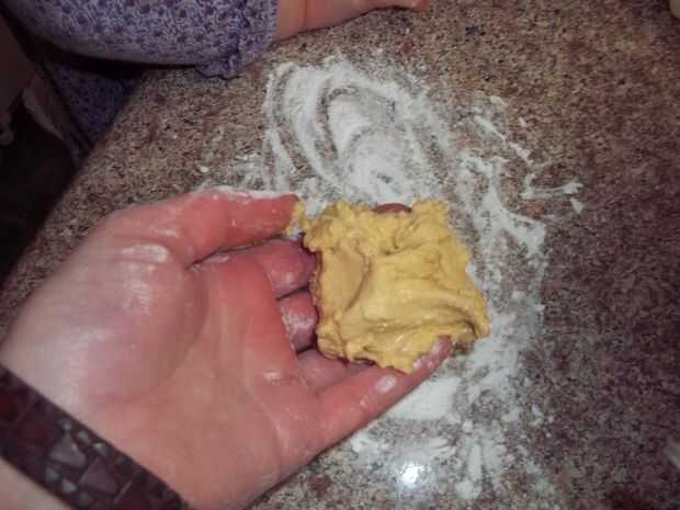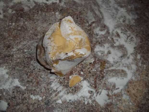 Ahora enrollo como un taco y luego como un caracol. Debe ser una bola del mismo tamaño que usted comenzó con. Poner algunos más almidón en el mostrador y rodillo a 1/4 de pulgada otra vez. poner en una hoja de envoltura de plástico, luego hacer el resto de ellos lo mismo.