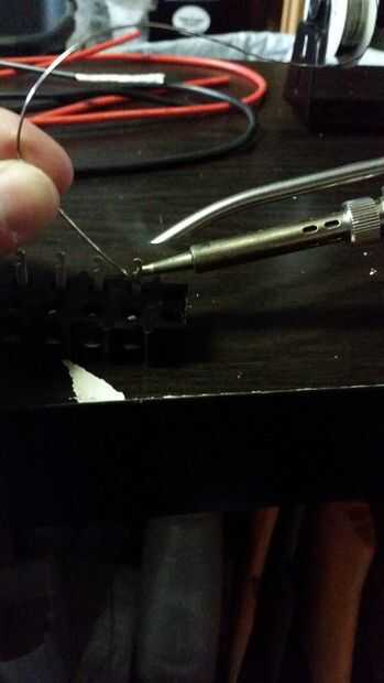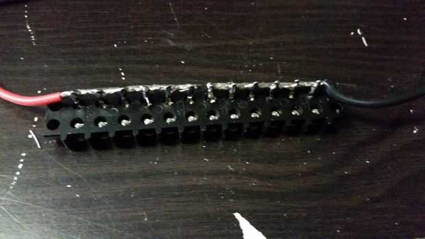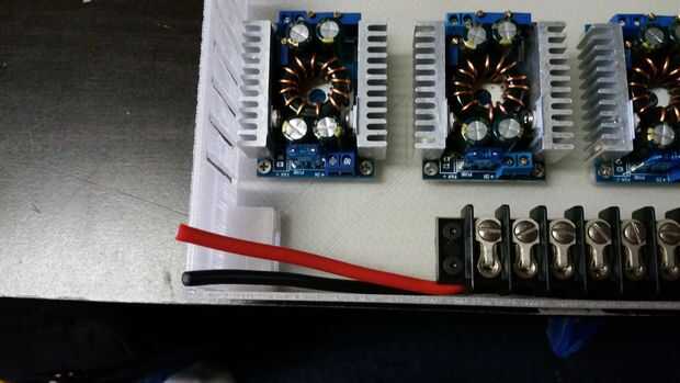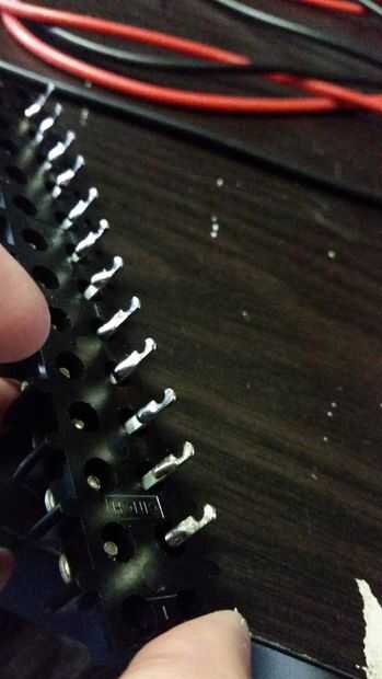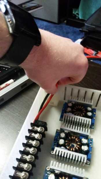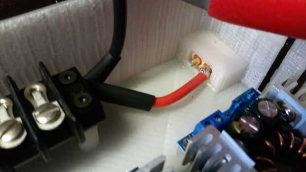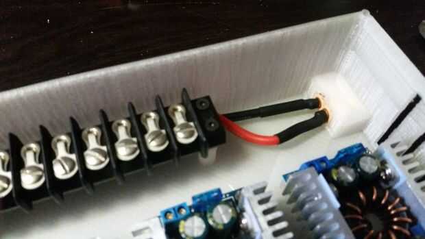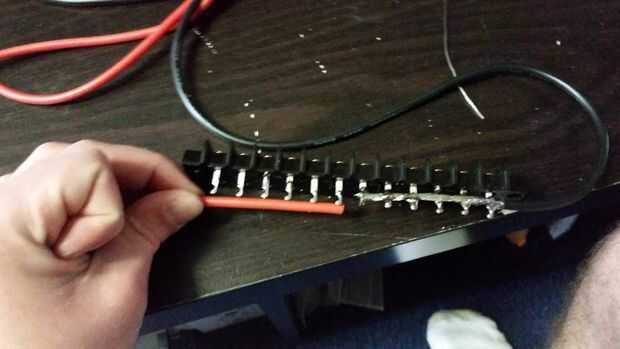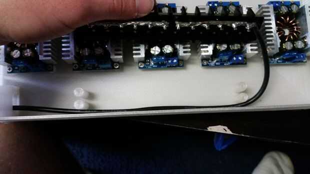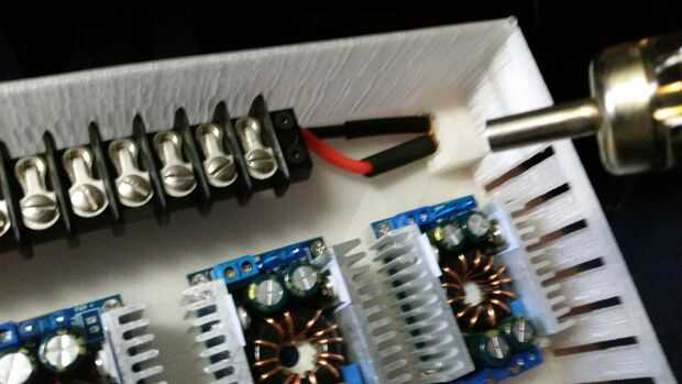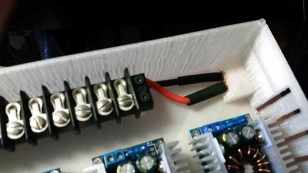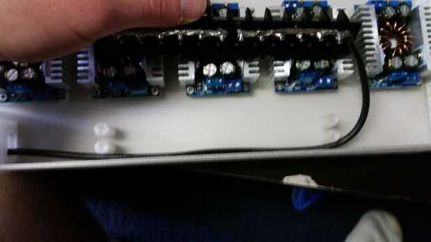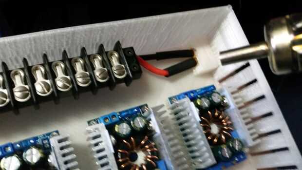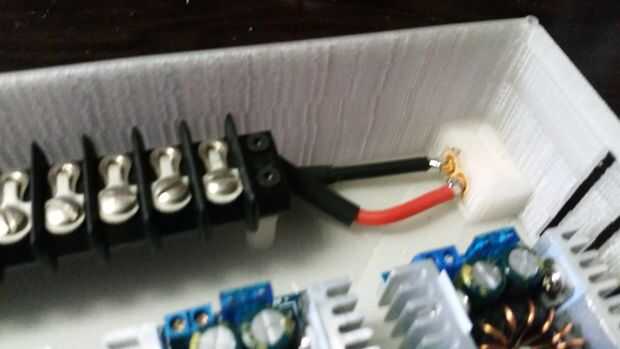 En este paso vamos a conseguir la barra configurado e instalado en el caso de la parte inferior. En primer lugar por qué no obtener su paquete de cable de calibre 12 y la barra. Una vez que tengas esas cosas vamos a querer tira el negro cable suficiente para cubrir seis clavijas en la barra. Una vez hecho esto tuerza todos los filamentos y les lata como se ve en las fotos, entonces tienes que todas las 12 clavijas en la barra de la lata. Ahora la soldadura sobre el cable negro con sus seis clavijas en la barra como se muestra en las fotos. Asegúrese de obtener una buena soldadura de flujo entre el alambre y las clavijas o de lo contrario se generará calor. Hacer lo mismo para el cable rojo, pero va en las otras seis clavijas. Asegúrese de que la soldadura tal y como soy o de lo contrario usted se enganche hasta voltajes revertidos posteriormente. También tener en cuenta el medio donde hay sólo un pequeño espacio de separación negativo de positivo. Después de ésos se sueldan en, el cable negro de la curva como se muestra y distribuirlo en un lazo alrededor de las clavijas de montaje de la barra. Pone el cable rojo en la parte superior ya que viene como se muestra en las fotos. Tire ligeramente del cable negro para obtener la holgura fuera de él. Atornille la barra colectora con cuatro tornillos de 14 M3. Una vez que corte el alambre de 12 calibre exceso de la barra como se muestra en las fotos. Uno de los conectores hembra XT60 como muestra de la lata y poner algunas del encogimiento del calor en los cables (Asegúrese de empujar tan lejos como usted puede para que el calor de soldadura no encoja prematuramente). Luego empuje el conector hembra XT60 en como se muestra y tira de aproximadamente 1/4 pulgadas del calibre de los 12 cables saliendo de la barra. Asegúrese de que otra vez que usted siga las fotos exactamente para asegurar que la polaridad correcta en el terminal derecho del conector de la soldadura. El lado plano es positivo y rojo y el triángulo que forma lado negativo/negro. Sólo tienes que seguir las imágenes y es oro, o eso dicen. Por último empuje hacia arriba el encogimiento del calor y calor con la pistola de calor (que tiene uno, tratar de un secador de pelo si no en el ajuste de calor alto.) Van lanzar uno, se lo merece, luego continuar por.