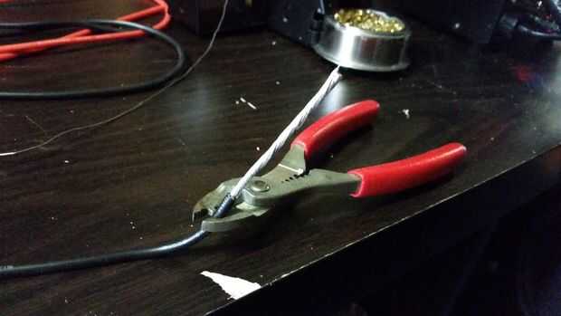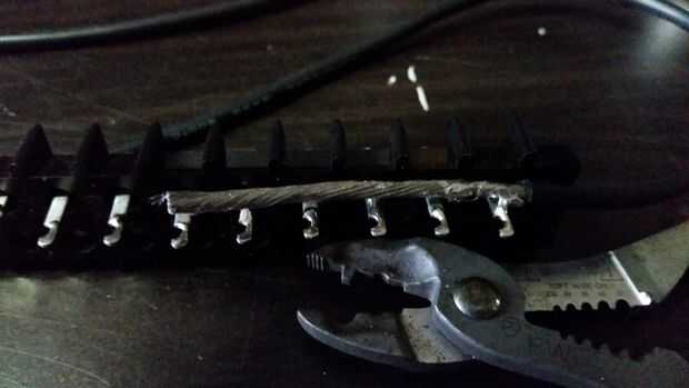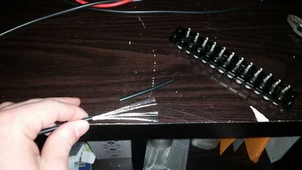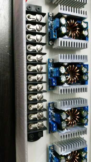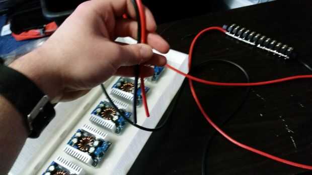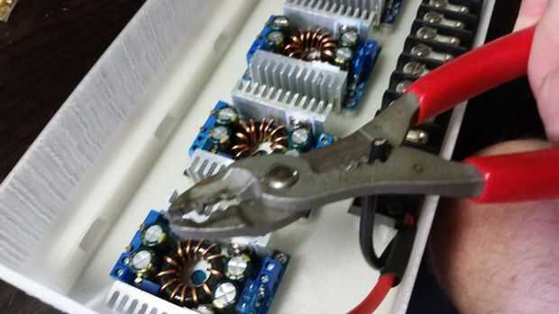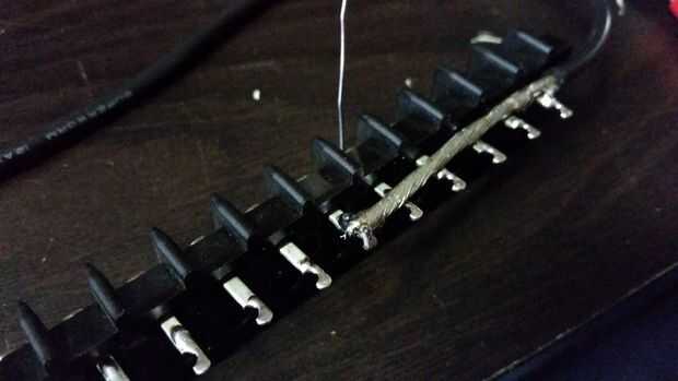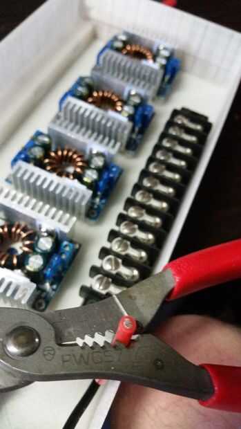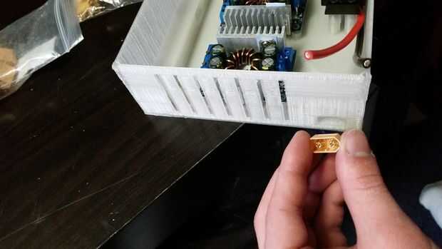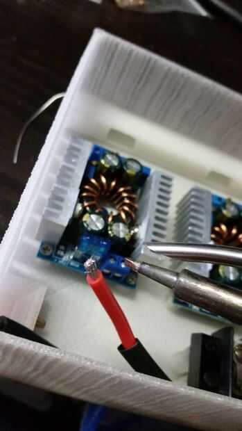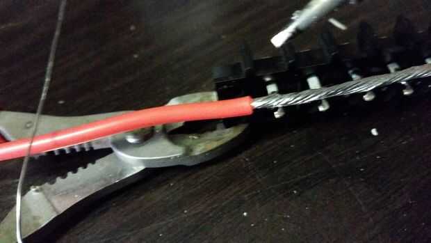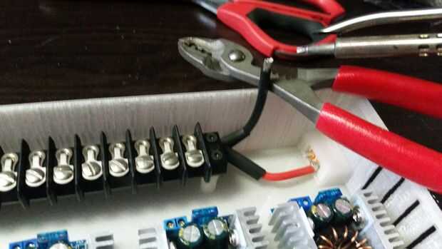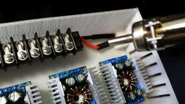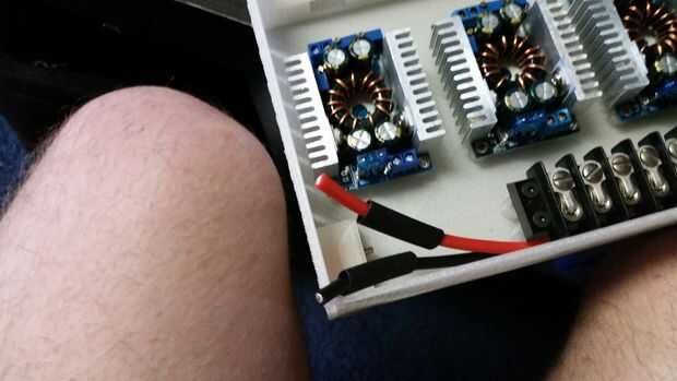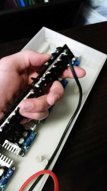 En este paso vamos a conseguir la barra configurado e instalado en el caso de la parte inferior. En primer lugar por qué no obtener su paquete de cable de calibre 12 y la barra. Una vez que tengas esas cosas vamos a querer tira el negro cable suficiente para cubrir seis clavijas en la barra. Una vez hecho esto tuerza todos los filamentos y les lata como se ve en las fotos, entonces tienes que todas las 12 clavijas en la barra de la lata. Ahora la soldadura sobre el cable negro con sus seis clavijas en la barra como se muestra en las fotos. Asegúrese de obtener una buena soldadura de flujo entre el alambre y las clavijas o de lo contrario se generará calor. Hacer lo mismo para el cable rojo, pero va en las otras seis clavijas. Asegúrese de que la soldadura tal y como soy o de lo contrario usted se enganche hasta voltajes revertidos posteriormente. También tener en cuenta el medio donde hay sólo un pequeño espacio de separación negativo de positivo. Después de ésos se sueldan en, el cable negro de la curva como se muestra y distribuirlo en un lazo alrededor de las clavijas de montaje de la barra. Pone el cable rojo en la parte superior ya que viene como se muestra en las fotos. Tire ligeramente del cable negro para obtener la holgura fuera de él. Atornille la barra colectora con cuatro tornillos de 14 M3. Una vez que corte el alambre de 12 calibre exceso de la barra como se muestra en las fotos. Uno de los conectores hembra XT60 como muestra de la lata y poner algunas del encogimiento del calor en los cables (Asegúrese de empujar tan lejos como usted puede para que el calor de soldadura no encoja prematuramente). Luego empuje el conector hembra XT60 en como se muestra y tira de aproximadamente 1/4 pulgadas del calibre de los 12 cables saliendo de la barra. Asegúrese de que otra vez que usted siga las fotos exactamente para asegurar que la polaridad correcta en el terminal derecho del conector de la soldadura. El lado plano es positivo y rojo y el triángulo que forma lado negativo/negro. Sólo tienes que seguir las imágenes y es oro, o eso dicen. Por último empuje hacia arriba el encogimiento del calor y calor con la pistola de calor (que tiene uno, tratar de un secador de pelo si no en el ajuste de calor alto.) Van lanzar uno, se lo merece, luego continuar por.