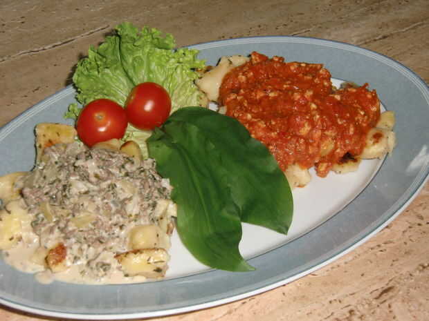 Por lo tanto, se fríen algo de carne picada junto con algunas cebollas y hierbas aromáticas en mantequilla de ajo. Desglasar con crema y impissate él.