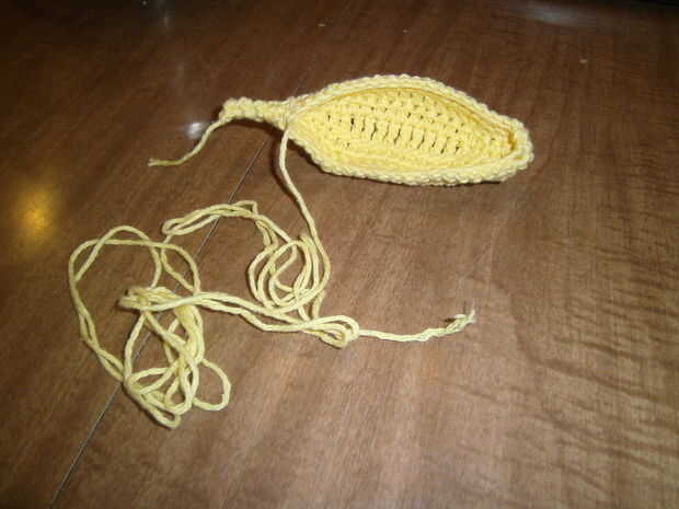 Ahora fije apagado, dejando una cola que es dos veces tan larga como el plátano. Usaremos coser la costura de cierre.