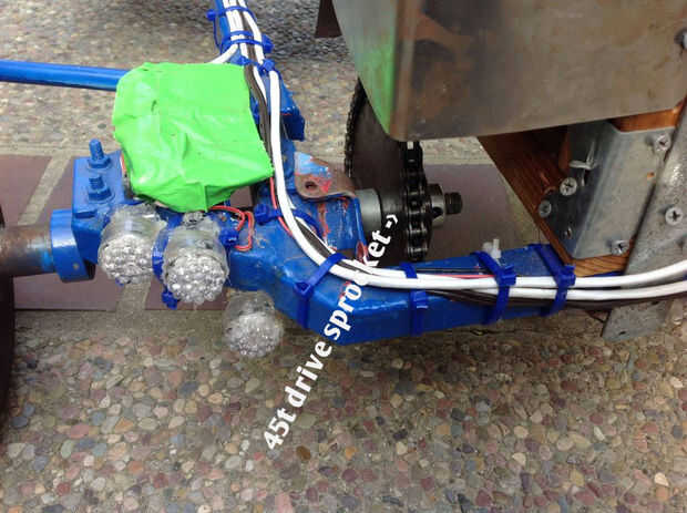 Esto es bastante sencillo. Seleccione los piñones con el diámetro correcto y el tamaño de la cadena (que en mi caso era de 5/8 y #35) y encadenarlos juntos. El piñón motor, sin embargo, será más difícil. Eje de mi motor era de 6mm, un tamaño métrico. Encontré un buje con un diámetro interno de 6mm y un diámetro exterior de 3/4", actuando con eficacia como un métrico a imperial convertidor. Luego a un piñón 3/4" diámetro del buje y poner en el motor. Coloque los tornillos de la rueda dentada de tal forma que sujete el manguito en el eje del motor y añadir Loctite (a menos que desee ser capaz de eliminar). Tenga cuidado de usar el eje ya que se extiende fuera del motor en lugar del adaptador de hélice (generalmente) incluido. De lo contrario, el motor puede doblar de la tensión lateral, que no está diseñado para. (Mina era un motor de aeroplano de rc, por lo que se construyó para las hélices de giro). Montaje del motor que utilicé fue la bancada gran aviones grandes. Sin embargo, tuve que perforar agujeros adicionales porque el motor tenía un patrón de montaje diferentes.