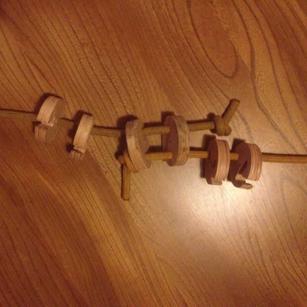 Hacer un lazo de la cuerda con las 6 piezas de madera en el lugar correcto, como se ve en la figura 3.