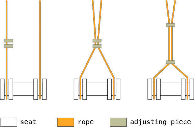 Encontrar un árbol que es conveniente (cuadro 1), la cuerda del columpio (Foto 2) y tiro sobre una rama (cuadro 3). Ajustar la altura, si es necesario, moviendo los madera discos alejados uno del otro, acortar; o Deslice uno al otro, para ampliar (foto 4/5). Asegúrese de que los dos lazos colgando de la rama son de igual altura (cuadro 5). Ahora usted puede colgar el asiento en la cuerda (foto 6/7). Sólo una cosa por hacer antes de comenzar a hacer pivotar, los 4 discos colgando de la cuerda, deslice la cuerda opuesta en el hueco del disco, aportando la cuerdas juntas (Foto 8/9). Mueva dos de los discos más altos posible y deslice los otros dos abajo (cuadro 10).