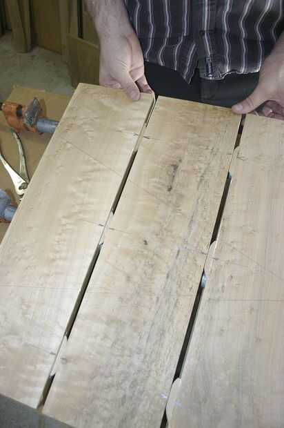 Encajar todas las piezas del marco para obtener las dimensiones de las piezas superior e inferior. (sólo haciendo la matemática a la figura que hacia fuera puede dejar huecos entre la tapa y marco). Compré una tabla de arce Birdseye mi top, por lo que tuvo que cortar a la longitud y pegados juntos para obtener la forma cuadrada. Utilicé galletas juntas para la tapa, con la esperanza de que sería más fuerte y resistir la deformación mejor.