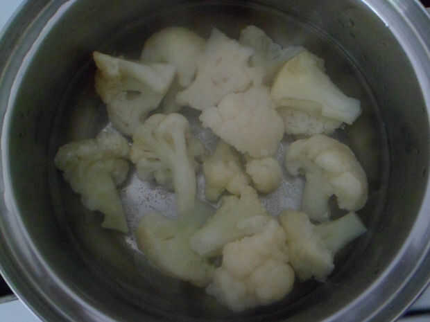 -Tome un vaso y agregar agua a la misma. Añadir la sal. Cuando el agua comience a hervir agregar la coliflor.