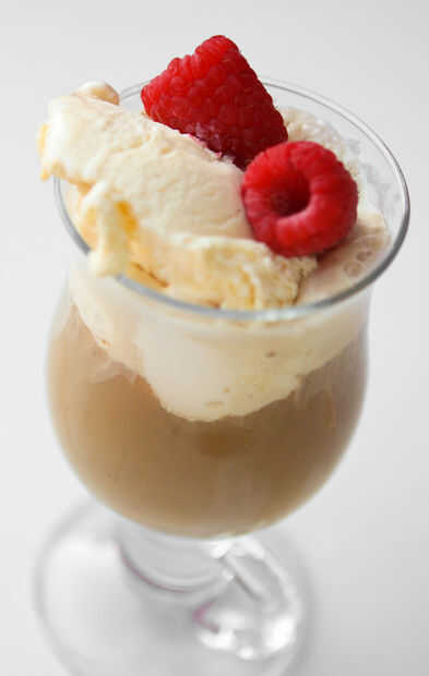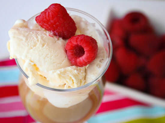 Añadir 2 cucharadas de helado de vainilla y la taza de cristal superior con frambuesas frescas.