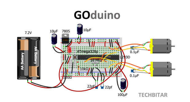 Así que he decidido al controlador de robot de GOduino de diseño low cost "run-time" que combina la funcionalidad de Arduino Uno y, hasta cierto punto, el escudo del motor. Para esta guía, he usado un protoboard pero podría también han soldado la GOduino en un PCB.