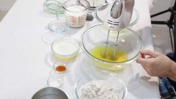 Primero en un tazón grande, poner la yema de huevo ahí, I generalmente se toma dos tazones de fuente grandes, crack y separar mis huevos y poner las yemas en un tazón y los blancos en el otro recipiente. A continuación añadir el azúcar, luego con un mezclador de mezclar los dos juntos.
