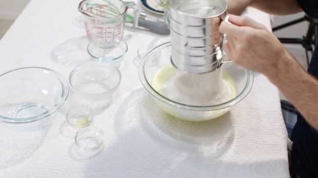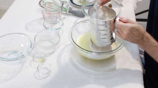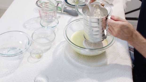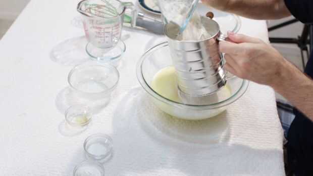 Ahora agregamos los ingredientes secos. Me gusta usar un tamiz, pero no es absolutamente necesario. Añadir primero la harina, luego la sal y el polvo de hornear. Tamizar o mezclar juntos. Si no utiliza un mezclador, es una buena idea mezclar todos los ingredientes secos con un bate en otro bol, en primer lugar, antes de agregar a la mezcla líquida.