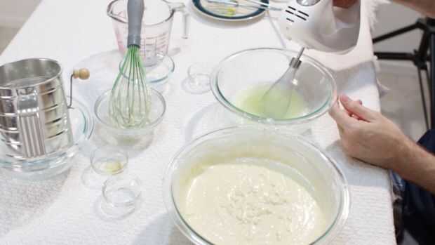 Ahora bate las claras de huevo, hasta formar picos buscando agradables, prácticamente sólo un montón de burbujas. Tengo una batidora para mi batidora de mano, que funciona muy bien, o puede utilizar un tradicional batidor o un tenedor y batir las claras muy bien.