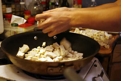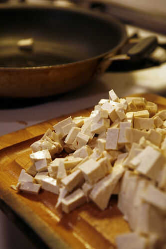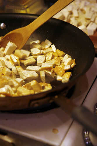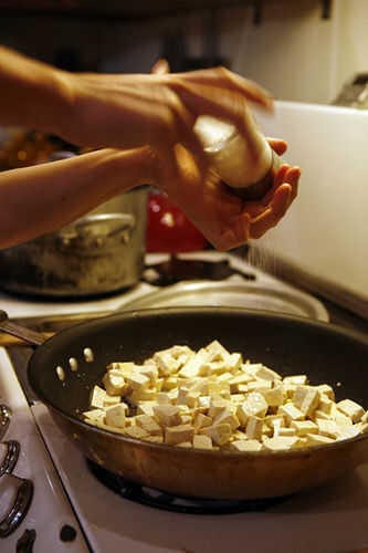 Dice arriba el tofu en trozos de 1/2"- 3/4". Poner un cuarto taza o menos de aceite de canola en una sartén. Añadir un chorrito de aceite de sésamo, si quieres algún sabor. Cuando el aceite esté caliente y agradable, agregar suficiente tofu para cubrir el fondo de la cacerola y deje que se Arden. Rociada de sal sobre la parte superior (dos cucharaditas), para más sabor. Alrededor, voltear de vez en cuando hasta que la mayoría de los trozos de tofu tienen dos o tres lados dorados.