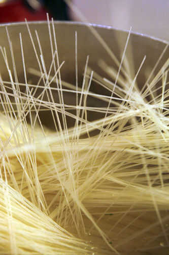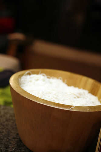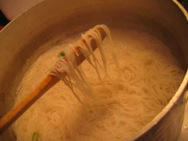 Poner una olla grande de agua a hervir y luego dejar caer en su "palillo del arroz" (fideos de arroz fino, recto). Estos cocinan en pocos minutos, así que quedarse y les tienden. No espere que los fideos para convertirse en totalmente suave. Mientras que todavía están