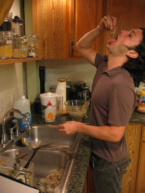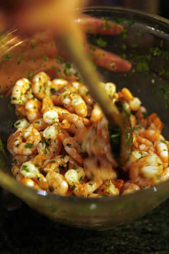 Mientras tanto, haz una olla de agua hasta hervir. Cuando los camarones están listos, drene la salmuera desde el tazón de fuente de mezcla y descarga los camarones en agua hirviendo. Camarones cocinar en pocos minutos, así que vigilar a tu olla. Cuándo empezar a cambiar a un color más claro, comenzar a tirar de uno ahora y después y ver si saben cocina. Tan pronto como están cerca, los saca y escurrirlas; camarón cocción excesivamente cocinada desarrolla una textura dura.