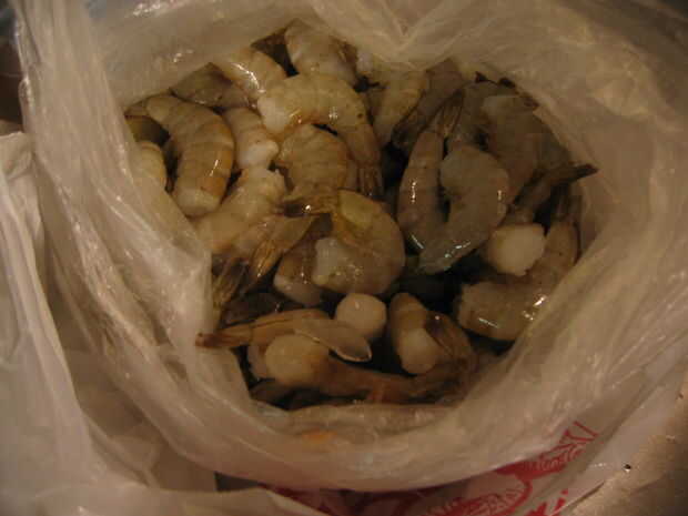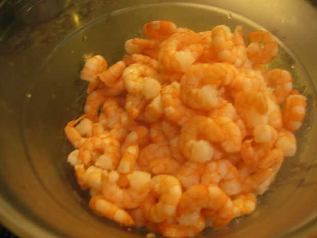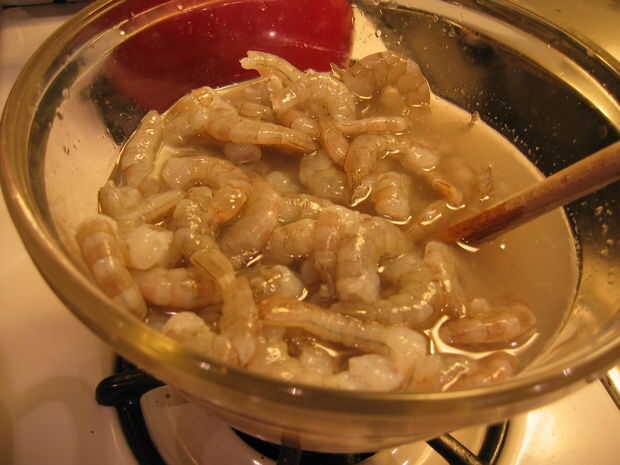Pele y quite la vena de tus camarones (o comprar camarón pelado con). Entonces, la salmuera de los camarones para que tengan ese bonito "pop" cuando ya están cocidos. A los camarones en salmuera, añadir sal al agua en un tazón hasta que se trata de agua de mar salado y agregue los camarones. Luego, añadir un puñado de cubitos de hielo para enfriarlos y coloque el recipiente en la nevera. Deje que la salmuera de camarones durante unos 30 minutos.