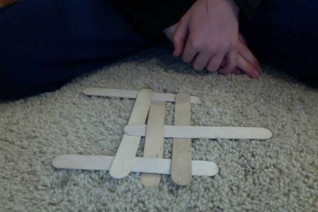 esto es fácil de construir y sólo utiliza 5 palitos. Explota cuando golpea el suelo. Un popsicle stick mi descanso pero generalmente no sucede.Paso 1: Esta es la parte fácil Solo mira la imagen.Paso 2: Esto es cuando se pone duro Asegúrese de constan