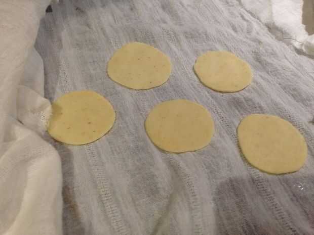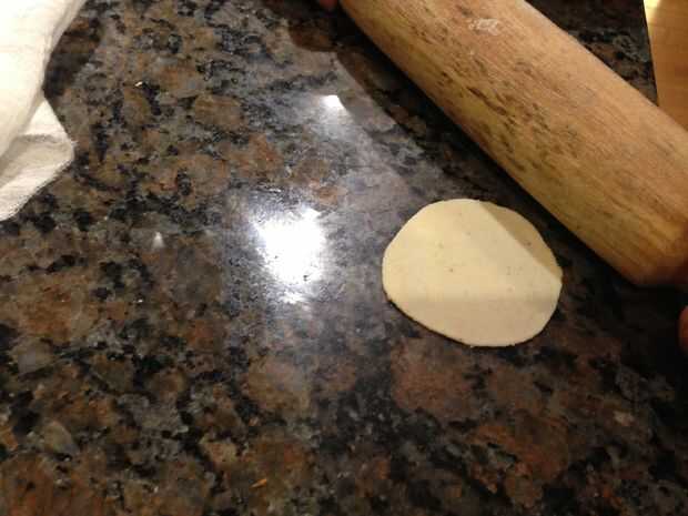 Pulsa las bolas creadas en las tortas planas circulares. Asegúrese de que las tortas planas son delgadas pero no demasiado fina. Mantenga las bolas prensadas en paño de algodón húmedo para que la harina no se deseque.