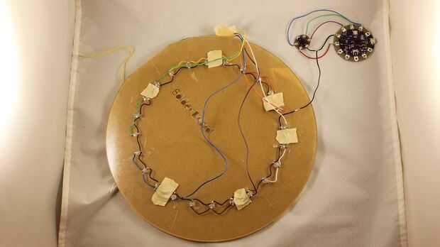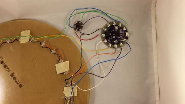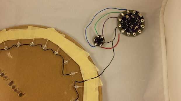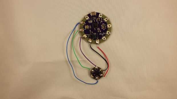 • La soldadura de la línea de negativo de los LEDs a la línea negativa de la unidad de acelerómetro/Lilypad.