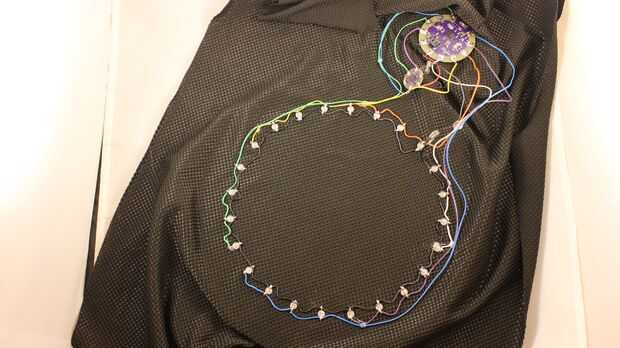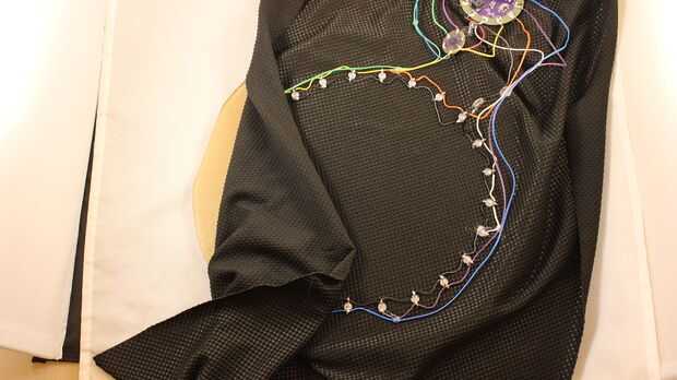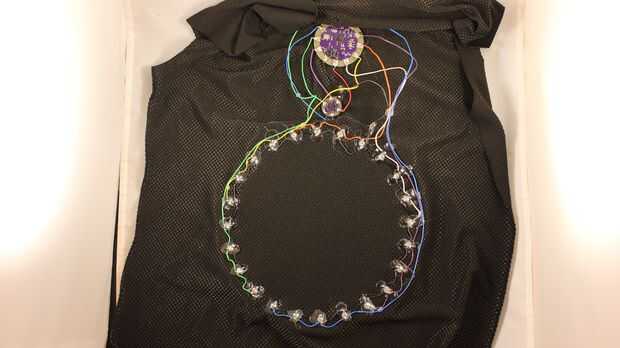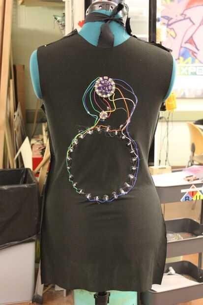 Tomar el circuito de la Junta de soldadura y colocar en la tela, haciendo estallar los LEDs a través de los agujeros. Vuelva a colocar a la tela con los LEDS en el mismo de la Junta de soldadura (de modo que la tela es entre la Junta de soldadura y la mayoría de la electrónica. Luego utilice pegamento caliente para fijar todos los LEDs, el acelerómetro y el Lilypad. Después de este punto, cubrió en la forma del vestido para asegurarse de que la electrónica donde exactamente donde necesitan estar.