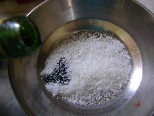 Si no hay copos de coco verde en su área, necesita teñirlos a ti mismo. Y es bastante simple.
