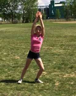 Acabado su voltereta con las manos por encima de su cabeza y sus pies como empezar.