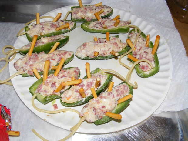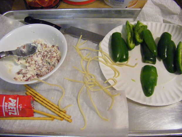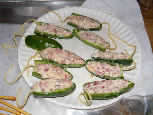 Cubrir el pimiento con la mezcla de relleno. Use sus dedos para presionar en la mezcla de queso.