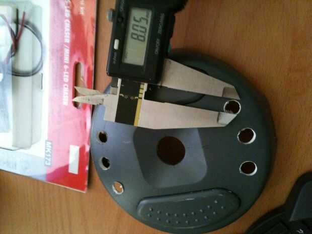 Perforé mis agujeros en alrededor de 8 mm de diámetro. Pero una pequeña presentación fue requerida para que los embellecedores de las LED le encajen bien.