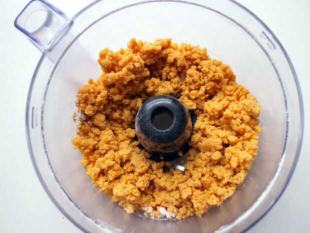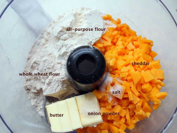 sharp de 6 onzas queso cheddar 4 cucharadas de mantequilla fría 1/4 taza de harina de trigo integral 1/2 taza de harina común 1/8 cucharadita de polvo de cebolla 1/4 cucharadita de sal de mesa