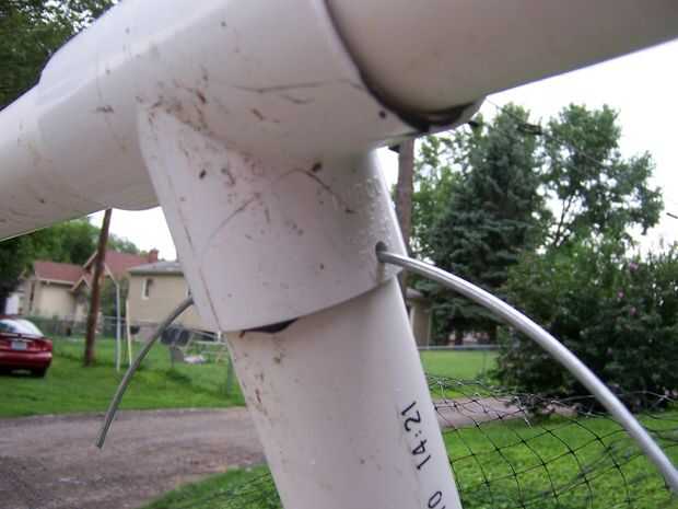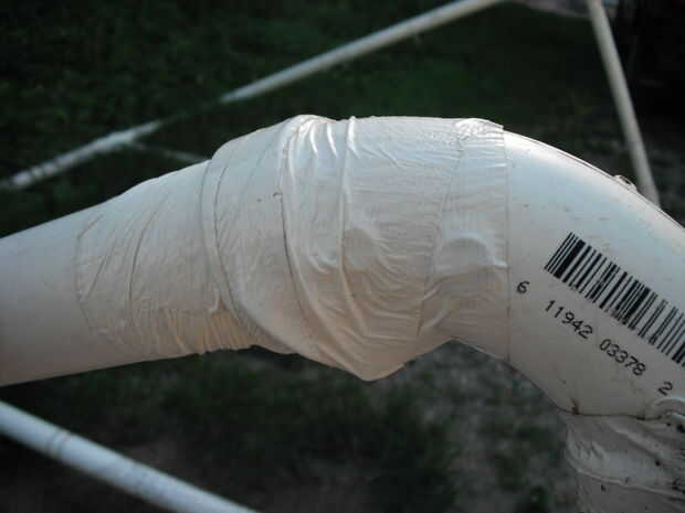 Después de algunas veces jugando con nuestros nuevos objetivos, el pegamento de PVC comenzó a fallar en algunas de las juntas más estresadas. Nuestro primer intento de rectificar esta cinta pato involucrados, que marca la única vez que he escuchado de cinta pato incapaces de solucionar un problema. Cansado de tratar de fijar los objetivos cada vez antes de que nos jugamos, decidí algún alambre galvanizado fijaría permanentemente el problema. La cinta pato blanco en la parte superior del cable ayuda a proteger las manos y los balones de fútbol de corriente en los extremos puntiagudos, así como la adición de cierto estilo. Cuando la perforación y el alambre de conexión, ejecutar siempre a la parte trasera de los objetivos. Si querías metas que podría colapsar, podría sustituir las uniones estratégicas con pernos que podrían desmontarse cuando termines.