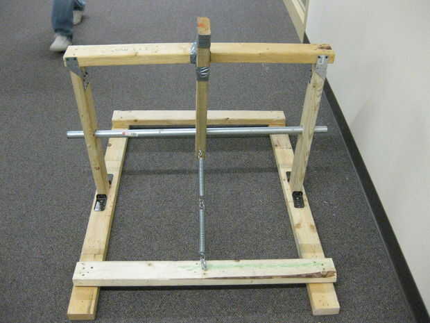 Proceda a conectar la otra pieza de dos pies de madera a los extremos opuestos de las piezas de tres pies de madera. Como puede ver en la imagen adjunta, esta pieza no es al final de las piezas de tres pies; Esto es porque, se determinó que sería demasiado difícil y probablemente peligroso para estirar los resortes que lejos. Si lo desea, puede experimentar con diferentes posiciones. Se utilizaron aproximadamente 2,5 pulgadas desde el extremo de las piezas de tres pies.