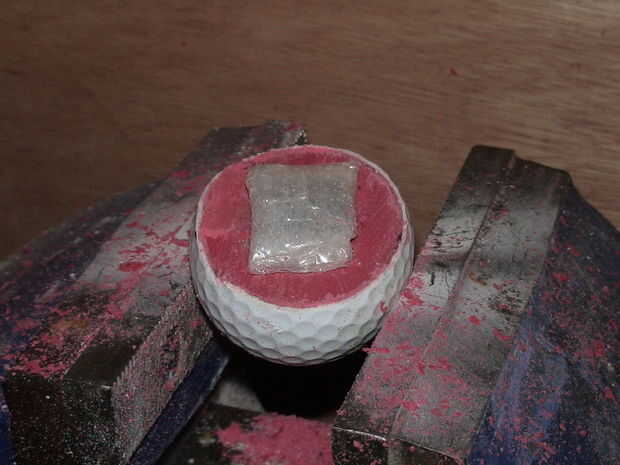 Una vez que estés listo para colocar la micro SD dentro de la bola de golf, necesita extraer una pequeña cantidad de la base para tener espacio para la tarjeta. Recomiendo hacerlo con una broca grande o un cincel. Usted debe ahuecar más entonces espacio suficiente, para permitir espacio para el relleno que se coloca en la tarjeta anterior.